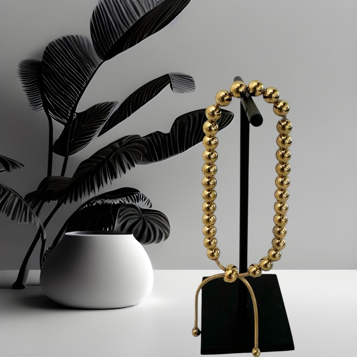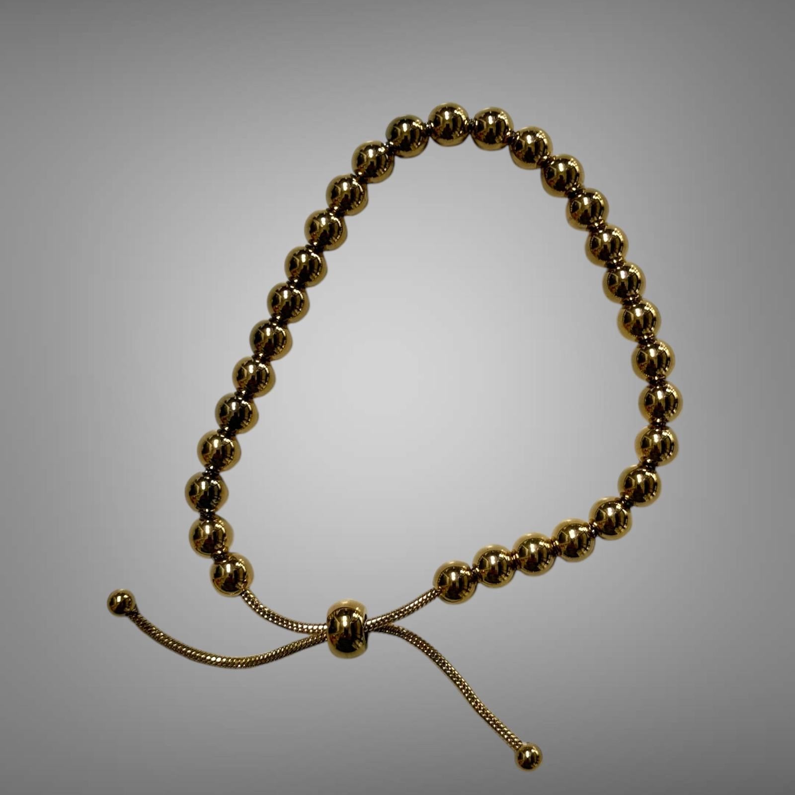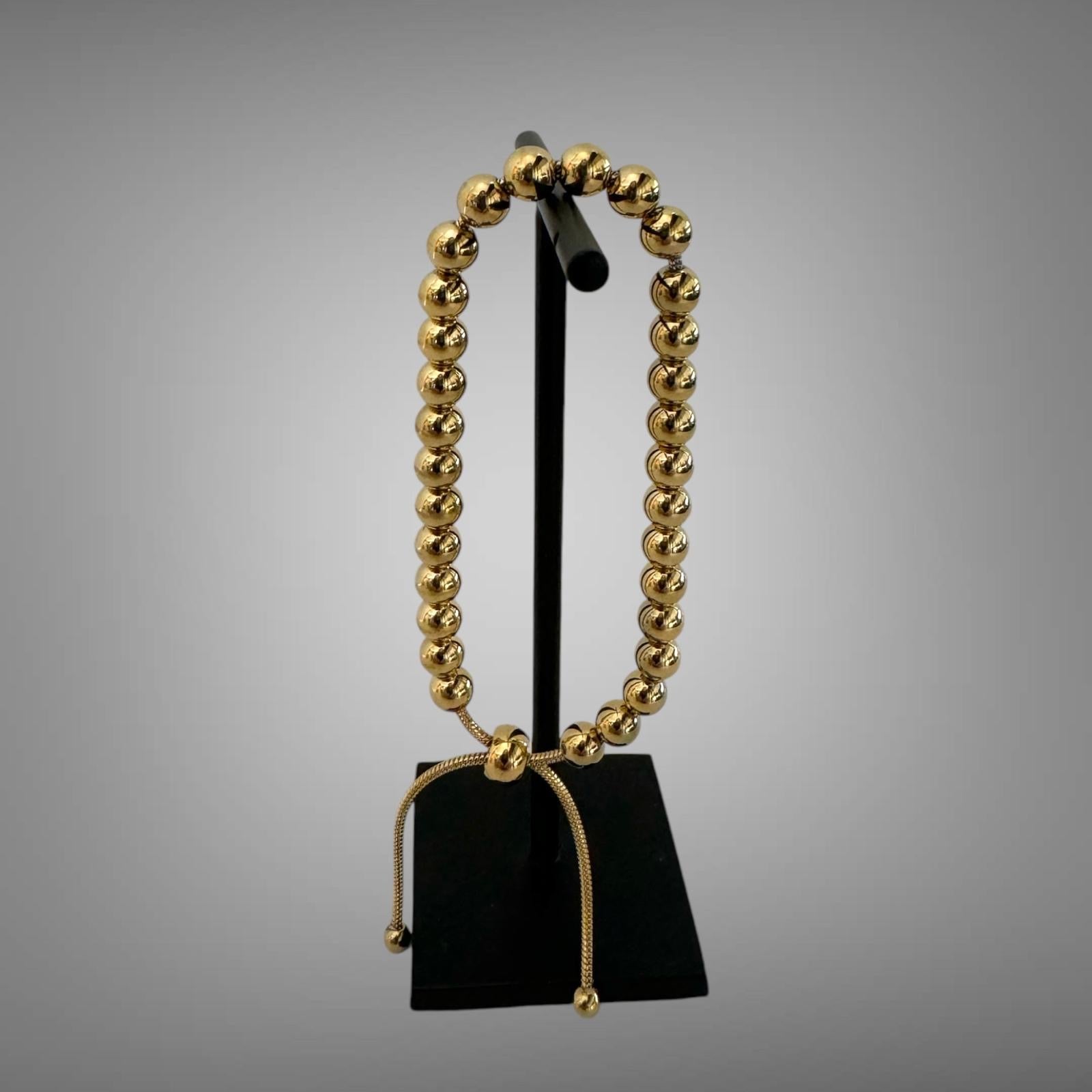 Dieses goldfarbene Armband aus Edelstahl ist mit eleganten, aneinandergereihten Kugeln verziert. Durch die Größenverstellbarkeit passt es perfekt an jedes Handgelenk. Ein stilvolles "Add on" für jedes Outfit. Einfach auflegen und glänzen.
