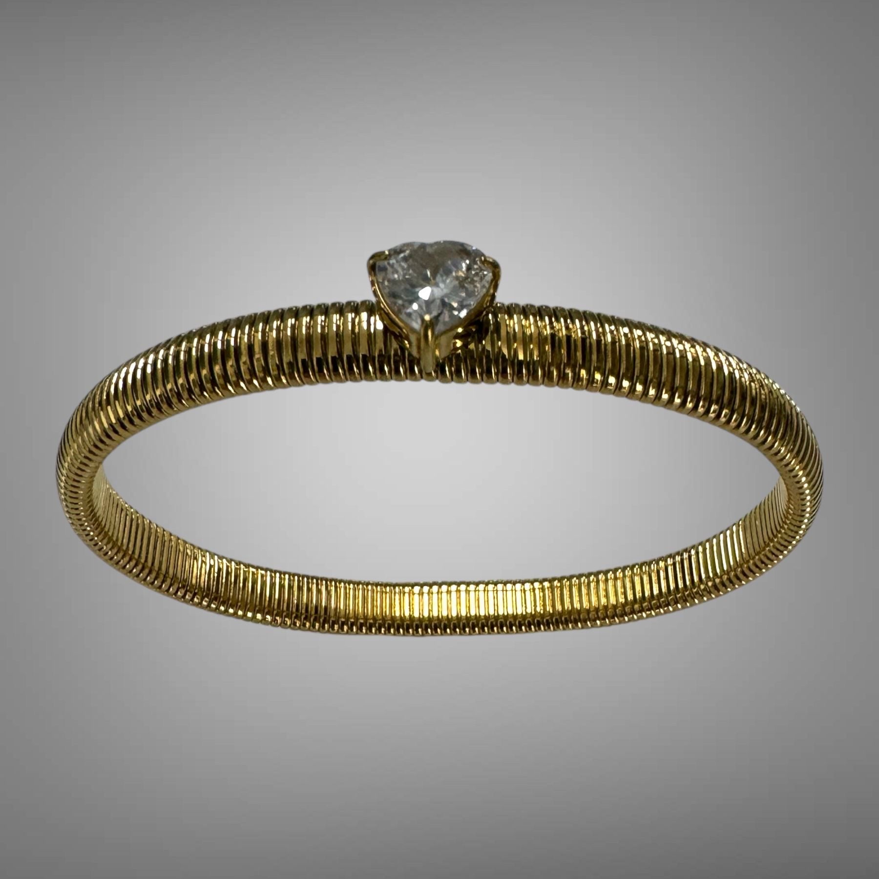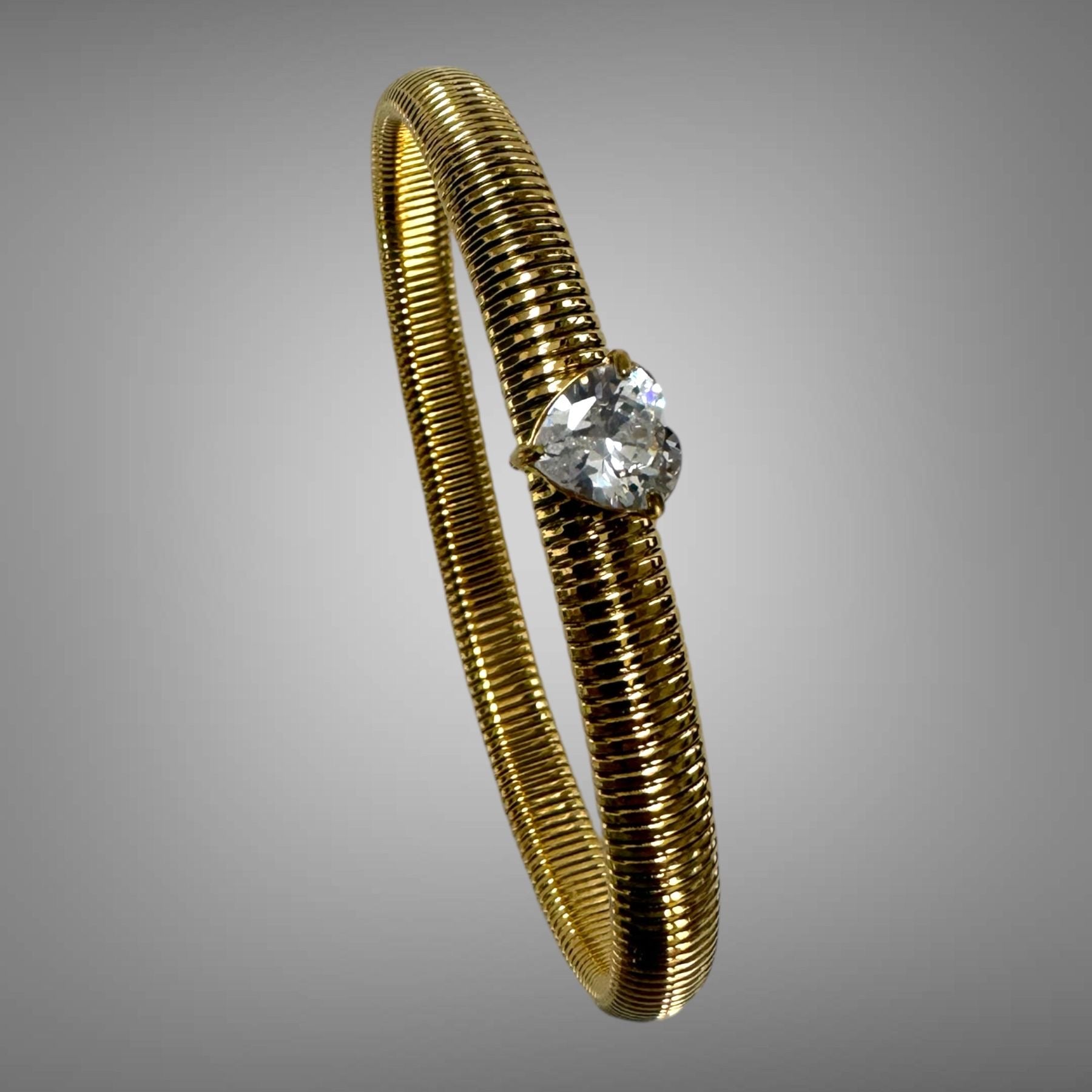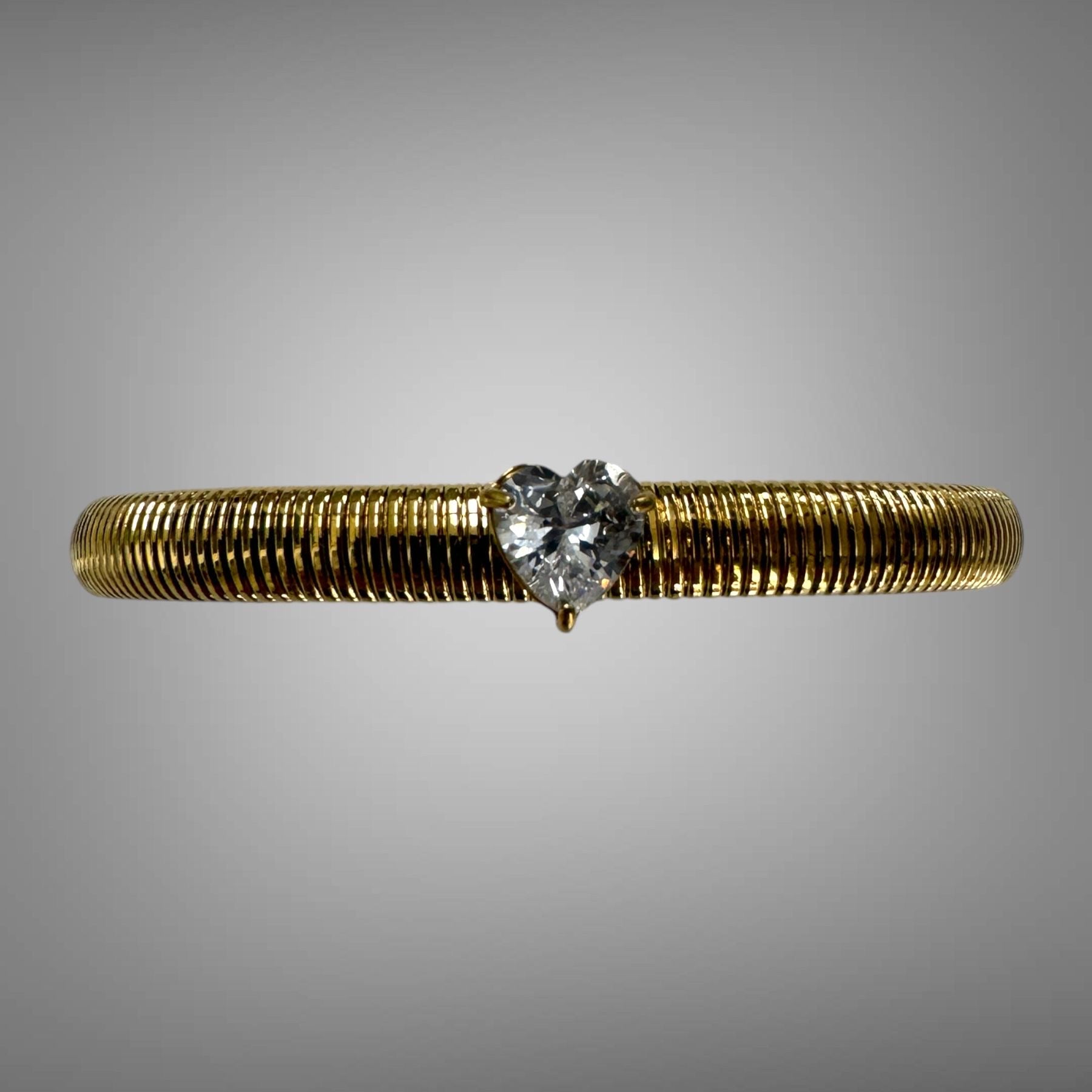 Ein flexibler Armreif aus Edelstahl in goldfarbener Ausführung mit einem Kristallherzelement ist ein elegantes und zugleich zartes Schmuckstück. Der flexible Armreif passt sich bequem dem Handgelenk an, während das Kristallherz einen funkelnden Akzent setzt, der dem Design eine romantische und edle Note verleiht. Die goldfarbene Edelstahl-Oberfläche sorgt für einen warmen, luxuriösen Glanz, der das Herz perfekt zur Geltung bringt. Dieser Armreif eignet sich ideal als Geschenk oder um einen Hauch von Glamour und Symbolik in den Alltag zu bringen.