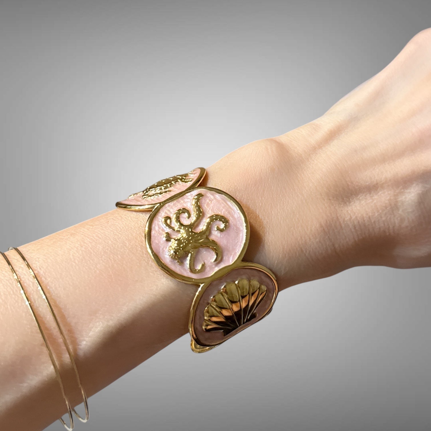 Der Armreif aus Perlmutt präsentiert ein Design mit Meeresmotiven und vermittelt ein sommerliches Gefühl. Diese Armspange kombiniert ästhetische Eleganz mit maritimen Elementen, ideal für die warme Jahreszeit. Ihre Vielseitigkeit macht sie zu einem passenden Accessoire für verschiedene Anlässe.