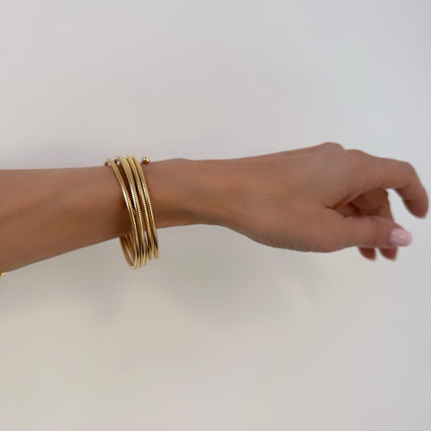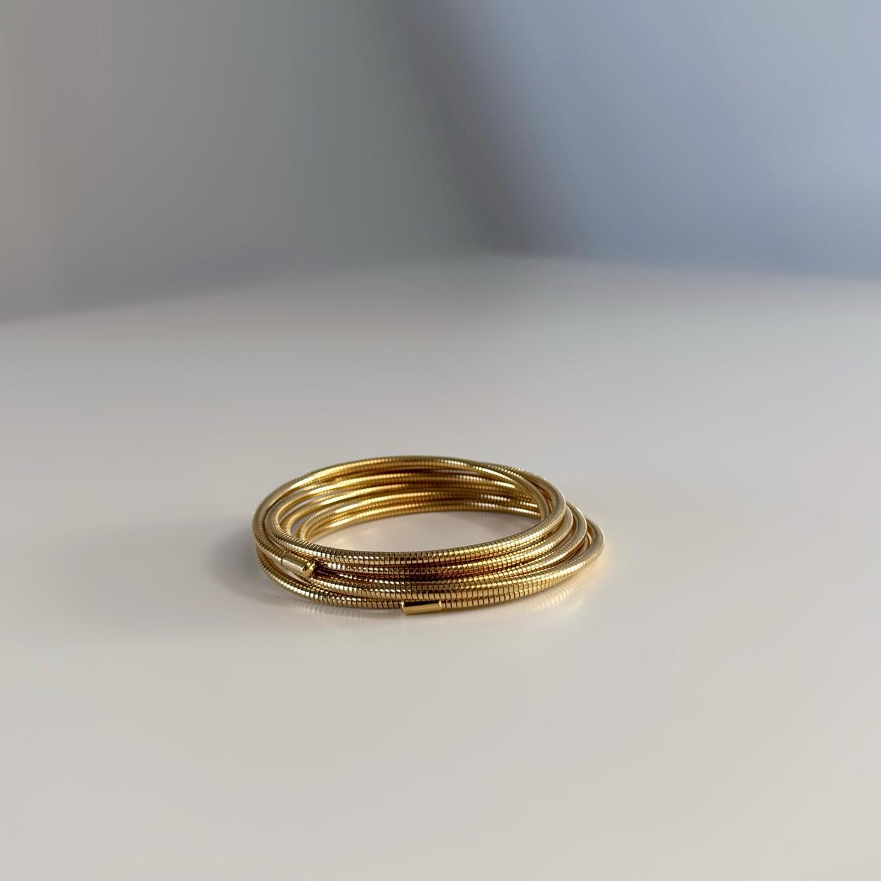 Der Armreif ist aus hochwertigem, goldfarbenem Edelstahl gefertigt und besticht durch sein mehrreihiges und modisches Design. Als Statement Piece verleiht er jedem Outfit das gewisse Etwas und ist ein echter Hingucker. Mit diesem Armreif bist du immer im Trend und setzt ein stilvolles Statement.