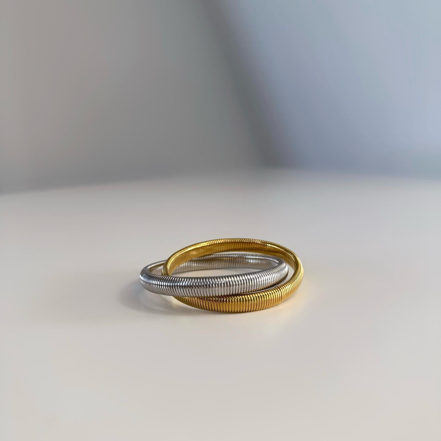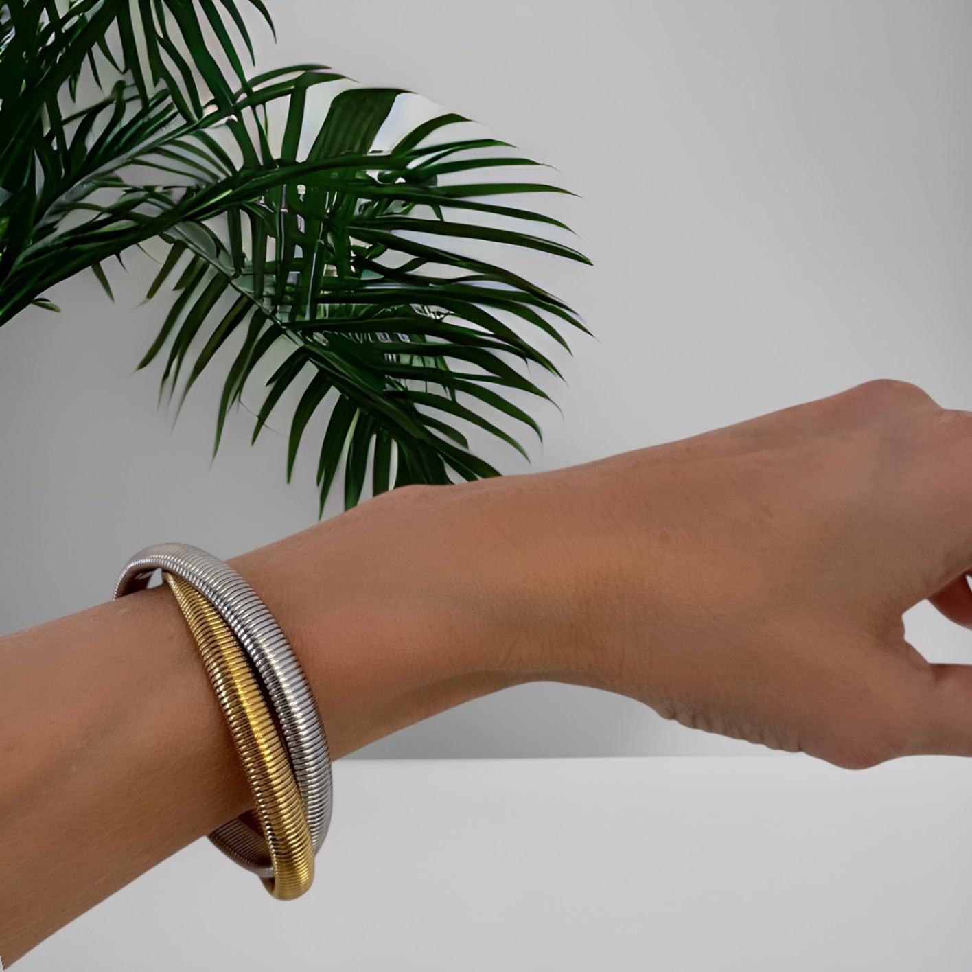Dieser Armreif ist ein praktisches 2-in-1-Accessoire, das sowohl in silber- als auch in goldfarben erhältlich ist. Dank des elastischen Materials bietet er einen angenehmen Tragekomfort und passt sich jedem Handgelenk an. Ein Must-have für jeden Schmuckliebhaber.