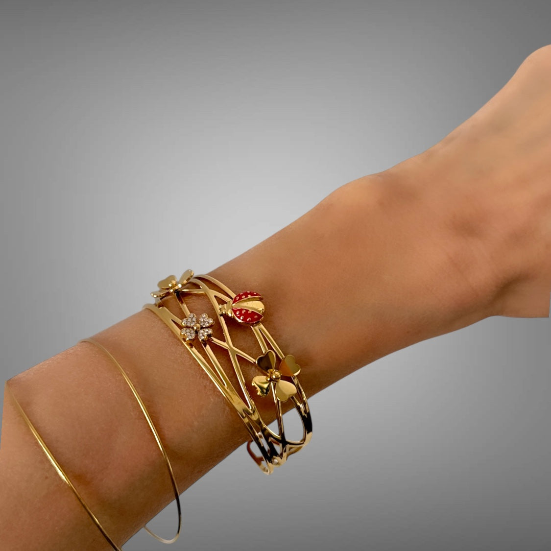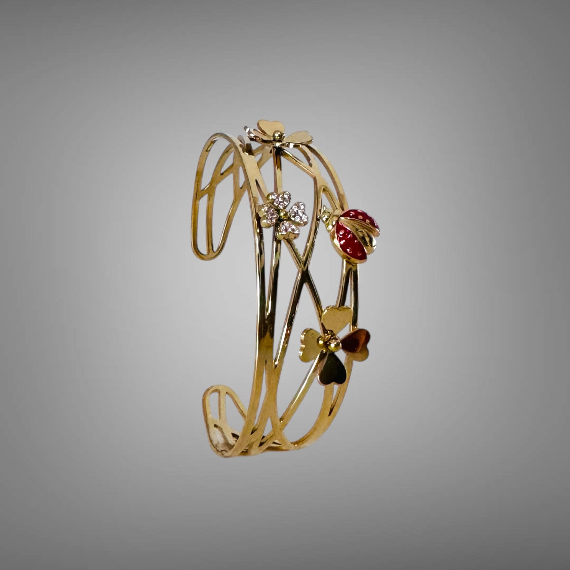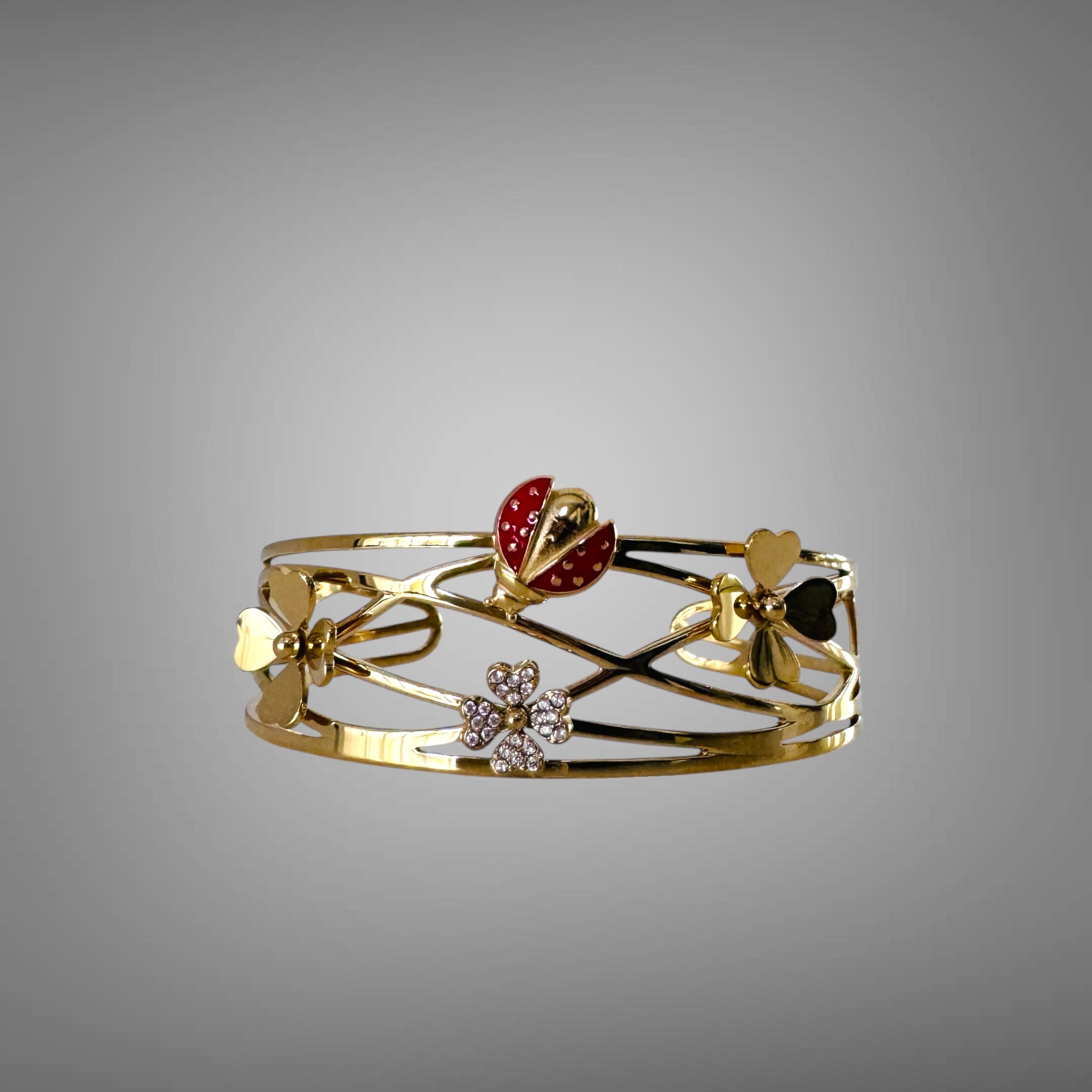 Der Armreif ist aus hochwertigen Materialien gefertigt und enthält Glücksbringer-Elemente, die symbolisch für positive Energien stehen.