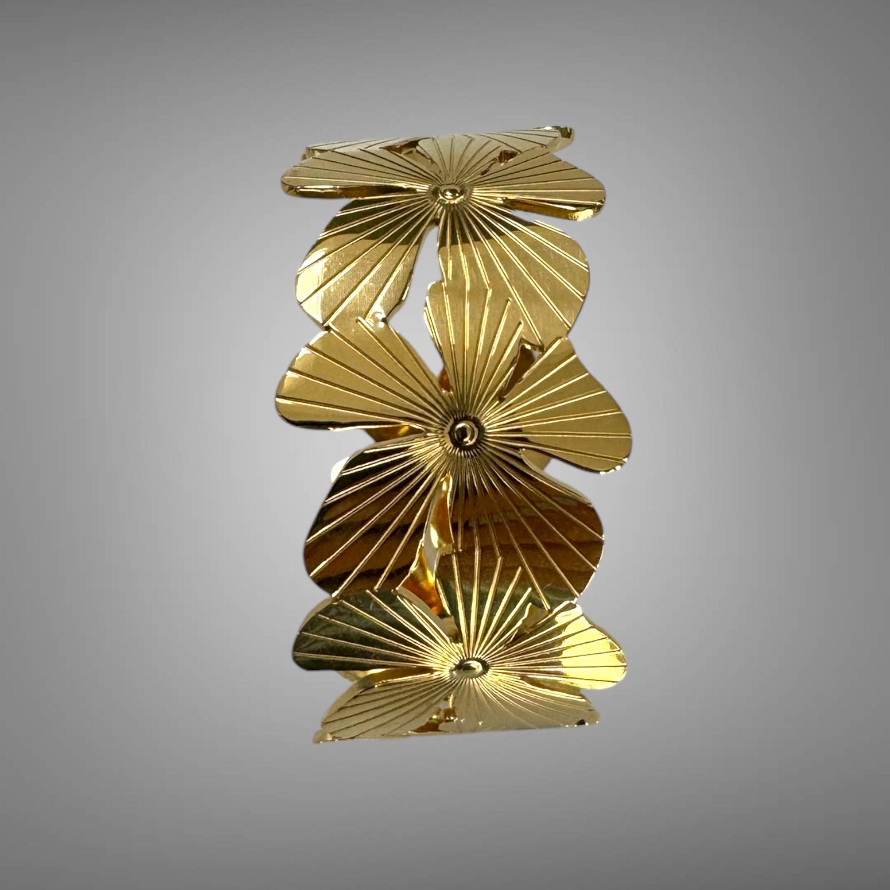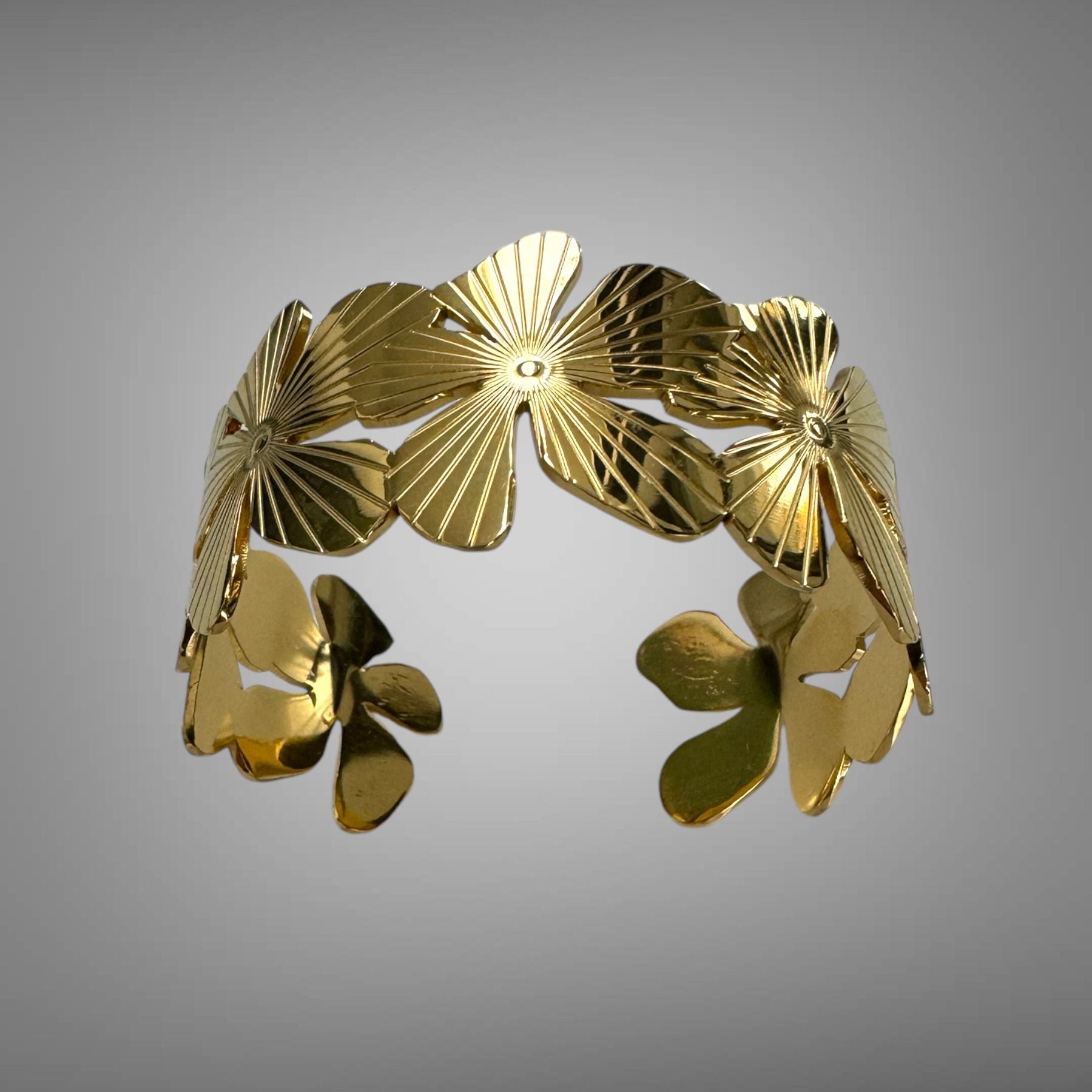 Hochwertiger Armreif aus Edelstahl mit vergoldeten Blütenelementen. Verleiht jedem Outfit einen Hauch von Eleganz und Stil. Perfekt für den täglichen Gebrauch, aber auch für jeden Anlass. Ein echtes Statement-Piece