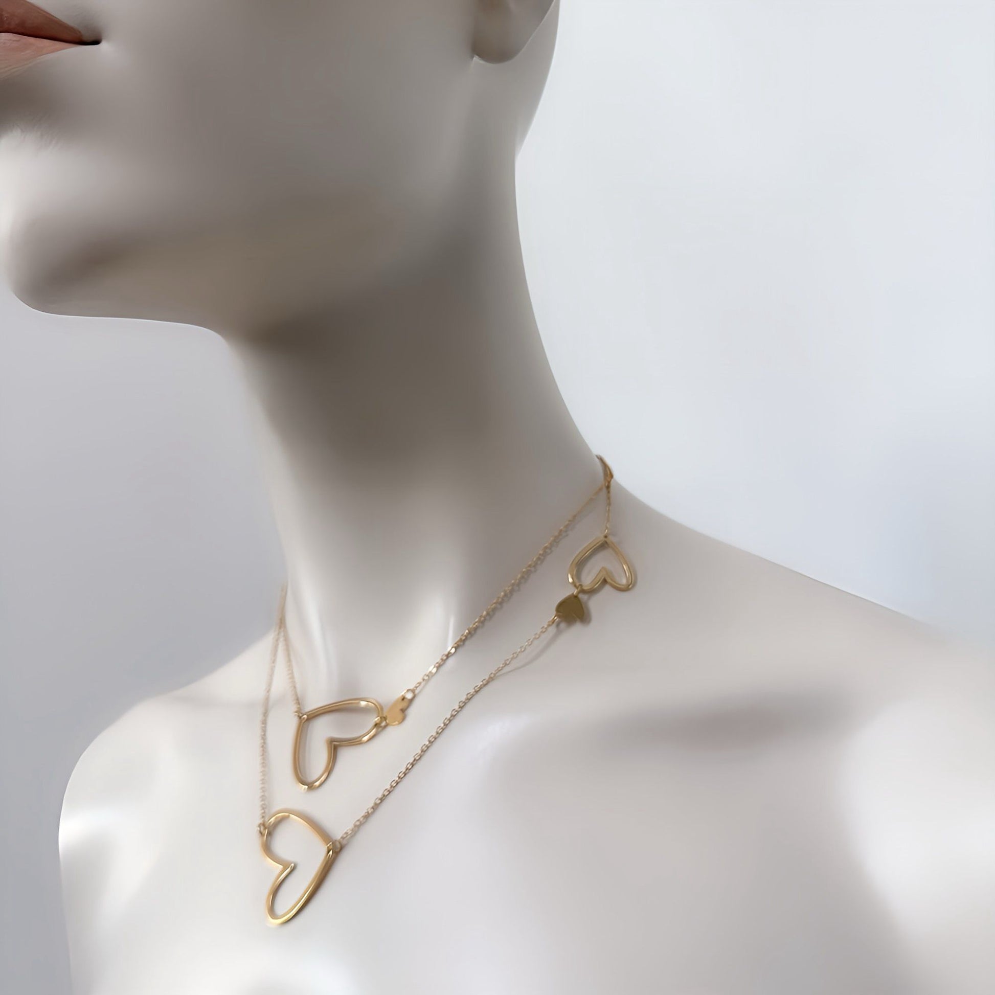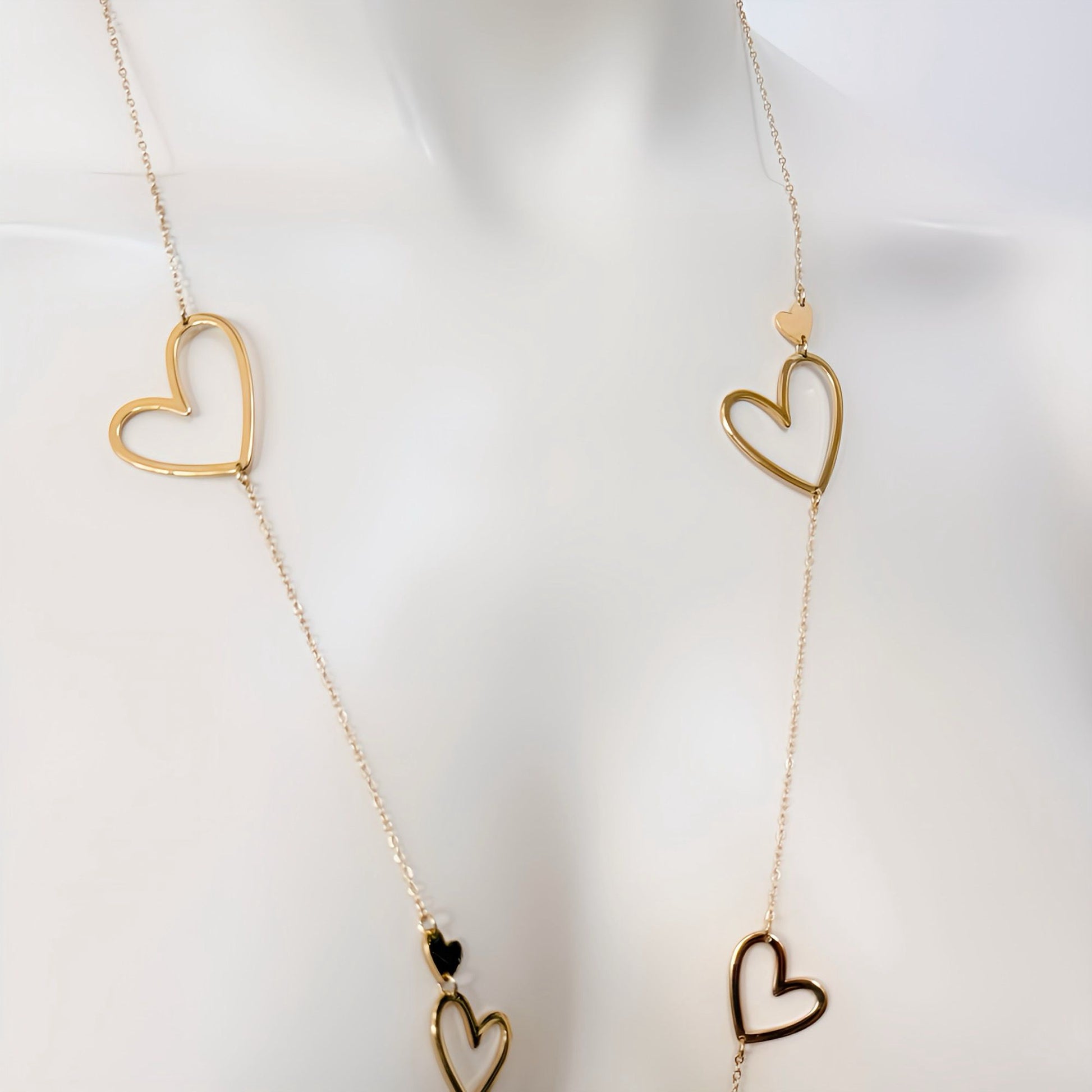 Diese elegante Kette aus goldfarbenem Edelstahl besticht durch ihre langen Glieder und kunstvoll gestalteten Herz-Elemente. Sie lässt sich vielseitig tragen – entweder lang für einen stilvollen Look oder doppelt gelegt als kürzere, moderne Variante. Dank hochwertiger Materialien ist sie besonders langlebig und ideal für den täglichen Gebrauch geeignet. Ein zeitloses Schmuckstück, das sowohl zu legeren als auch zu eleganten Outfits passt.