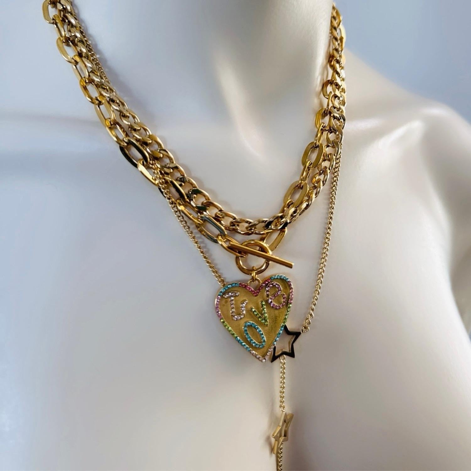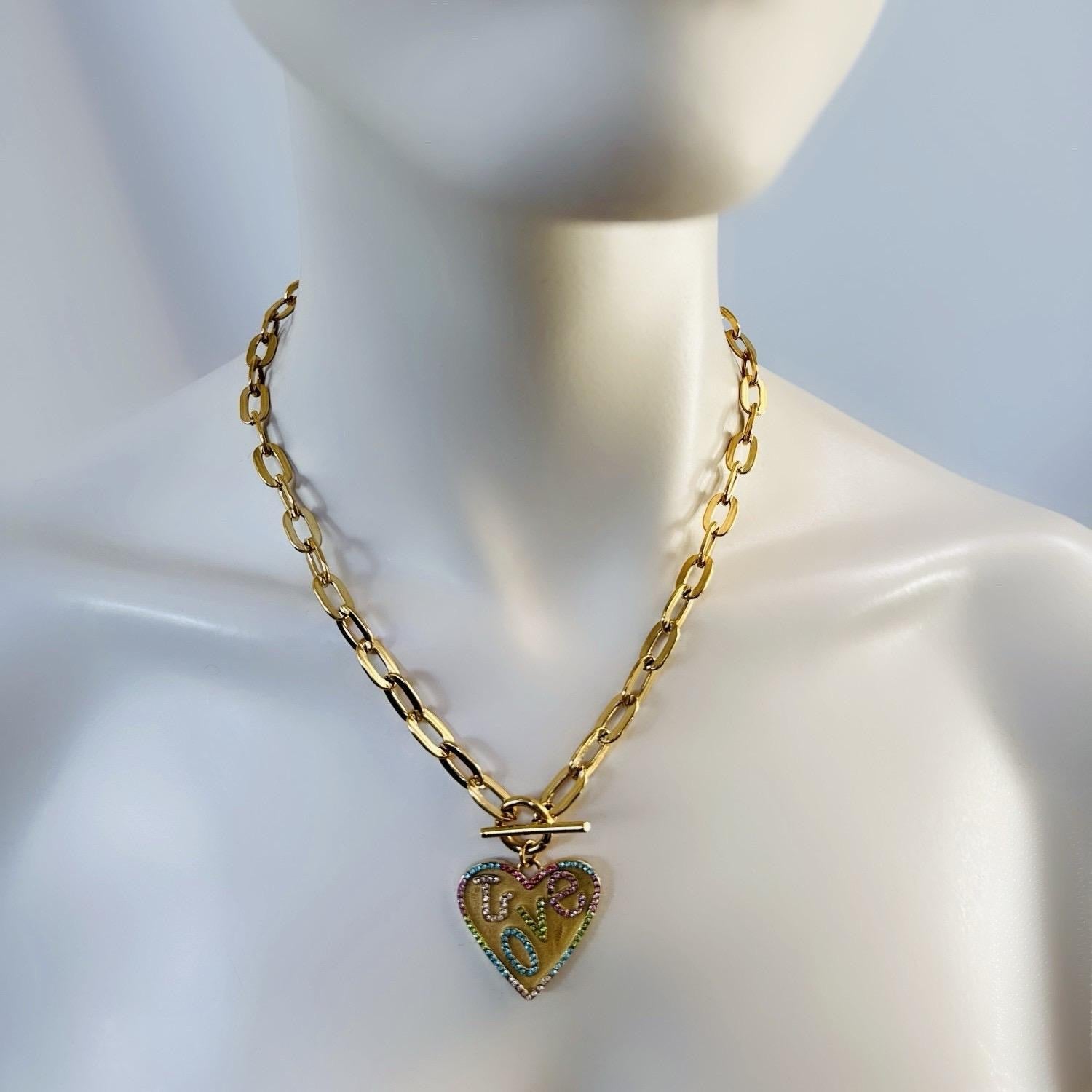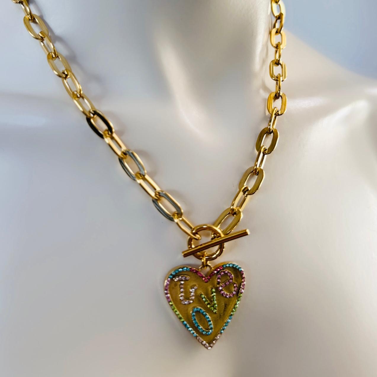 Diese goldfarbene Kette ist ein echtes Statement-Stück aus Edelstahl. Das Herzsymbol mit der Inschrift "LOVE" ist von bunten Zirkonia Steinen umrandet und verleiht jedem Outfit einen Hauch von Eleganz. Zeigen Sie Ihre Liebe mit dieser exklusiven Kette und lassen Sie sich von ihrem funkelnden Glanz verzaubern.