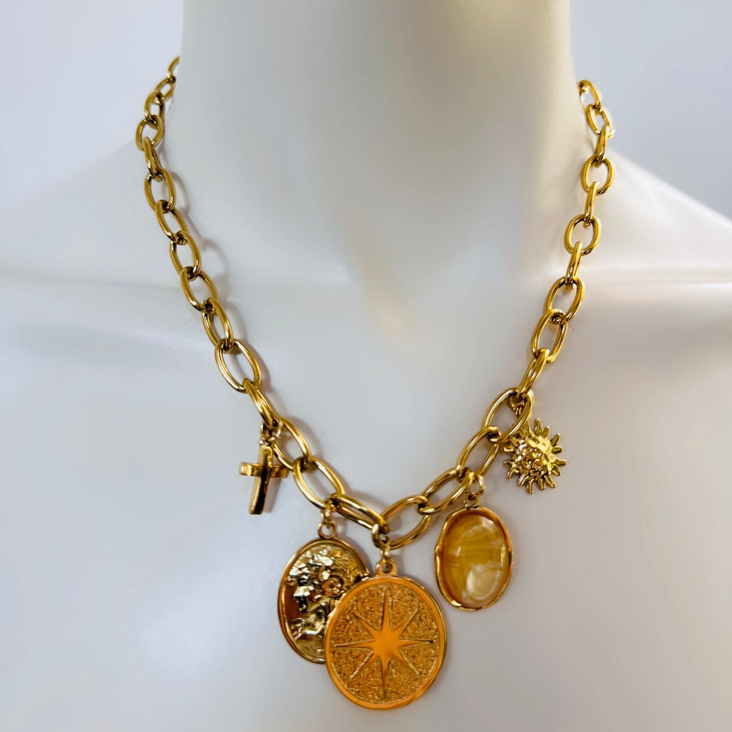 Diese wunderschöne Kette aus goldfarbenem Edelstahl ist ein wahrer Hingucker. Mit verschiedenen Charms verziert, ist sie das perfekte Statement-Piece für jeden Anlass. Lassen Sie sich von ihrem einzigartigen Charme verführen und gönnen Sie sich ein edles Highlight für Ihr Outfit.
