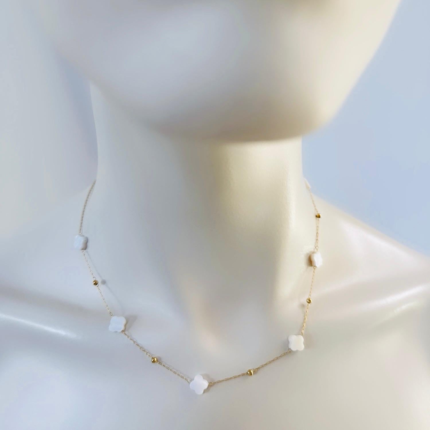 Die filigrane Kette ist mit feinen Perlmuttfarbenen Blüten besetzt und verleiht jedem Outfit eine edle Note. Das zarte Design ist ein Blickfang und verbindet Schönheit mit Eleganz. Perfekt für jede Gelegenheit und ein Must-Have für jeden Schmuckliebhaber.