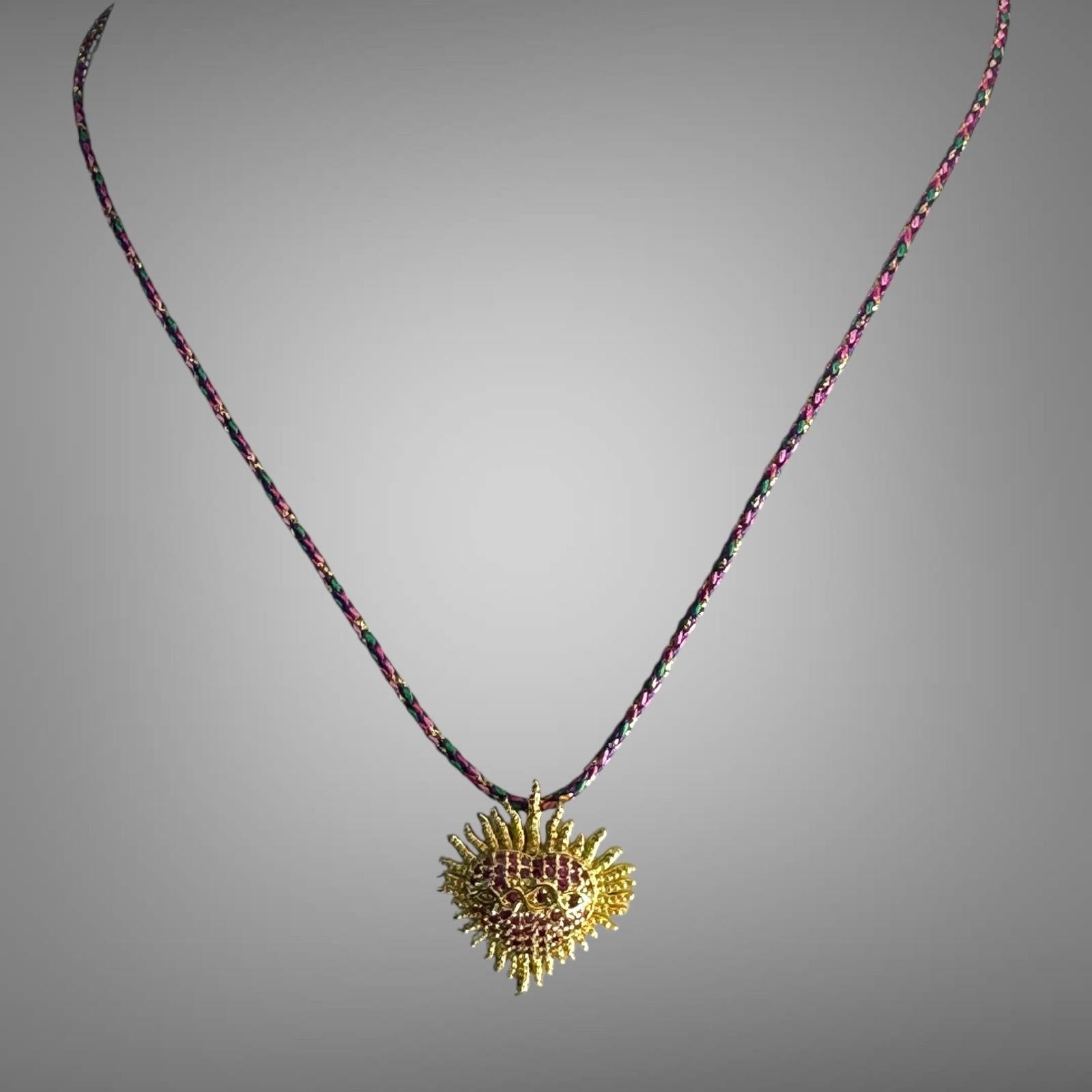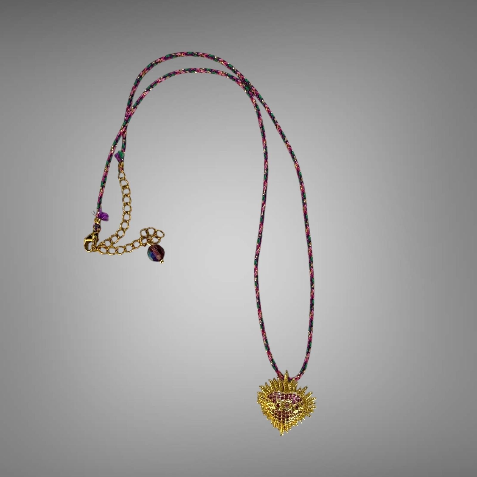 Kette aus hochwertigem Textilband ist das perfekte Accessoire für jeden Look. Mit ihrem wunderschönen herzförmigen Ornament, verziert mit funkelnden Steinchen in verschiedenen Farben, setzt sie auffällige Akzente und verleiht Ihrem Outfit das gewisse Etwas. Unser einzigartiges Design garantiert Ihnen einen stilvollen Auftritt, der alle Blicke auf sich zieht.